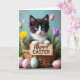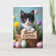Designed with a close-up view of a tiny black-and-white kitten peeking out from a rustic woven basket, the scene draws you in with bright blue eyes and a curious tilt of the head. Its fluffy fur catches soft, diffused light, and its white paws hold a small wooden plaque as if offering a sweet note to a friend. Centered on the plaque is a short festive greeting in simple lettering, painted in a dark tone that stands out against the warm wood. In the foreground, several pastel eggs with delicate patterns sit near the basket, adding gentle color and a cozy, shared-moment feel. Behind them, blurred tulips in sunny yellow, tender pink, and lavender create a romantic garden haze, like a quiet walk taken together 🌷. The background fades into a calm sky-blue wash that keeps the focus on the kitten’s tender, inviting gaze 🐰. The basket’s woven texture is clearly visible, with soft shadows falling along the rim and across the patterned eggs.