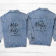 Jolie veste en denim pour les amis de la mariée à sa fête de bachelorette. Le dos présente "The Party" dans un script chic et un coeur et "Las Vegas, NV" dans une typographie moderne simple. Vous pouvez modifier la destination de la fête. Une veste coordonnée "Femme du Parti" est disponible pour la mariée.