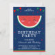 Éblouissez vos invités avec ce mignon invitation de fête d'anniversaire avec une adorable tranche de pastèque avec des éléments vibrants contre un arrière - plan bleu. Ajoutez simplement les détails de votre événement sur ce modèle facile à utiliser pour en faire une invitation unique. Retournez la carte pour révéler un élégant motif à rayures rouges et blanches au dos de la carte.