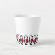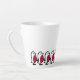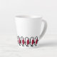 Cute robins marching across a latte mug. My original illustration of nine happy birds walking in a line, drawn in an elegant but rustic style designed to look like an ink stamp, with thick black lines and a flash of red.