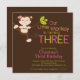 Commencez votre troisième anniversaire avec nos adorables invitations à des anniversaires de enfants de petite fille singe. Idéal pour les fêtes de 3e anniversaire ! Nos petites invitations sucrées aux singes sont accompagnées d'un mignon petit singe qui se balance sur une branche d'arbre et est posé sur un arrière - plan brun élégant. Notre invitation à la fête d'anniversaire pour les filles singes comporte un petit singe unique avec un casquette de fête et un arrière - plan de ballons. Visitez notre boutique pour trouver les cartes de remerciement, les autocollants d'anniversaire, les autocollants de remerciement et les timbres-poste. © Petit Tatti