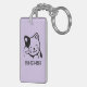Un porte - clé avec votre nom à l'avant et votre numéro de téléphone à l'arrière. Conçu avec l'illustration d'un chat kitty souriant et agitant avec une tache noire autour de son oreille. Arrière - plan de pois violet. Simple, mignon et adorable.