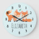 Wall clock with a graphic illustration of 3 orange foxes looking cute and happy. Light blue background. Personalize with a name.