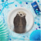 Papier Teller mit einem Foto eines niedlichen Otters stehend aufrecht im Wasser mit seinen Pfoten halten sein Gesicht. Sein Kopf kauerte zum links, süß und bezaubernd aussehend.