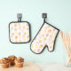Cute light pastel patterned oven glove and pot holder set decorated with tumbling cupcakes.