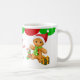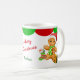 Sur cette mignonne tasse de Noël, un petit homme en pain d'épices apporte un bas et un emballage cadeau aux couleurs vives. Il porte une écharpe de polkadot verte et blanche et un chapeau de Père Noël rouge. L'image est imprimée deux fois sur la tasse, avec le nom de votre enfant en vert au centre, avec un accueil rouge vif. Le sommet de la tasse est bordé de coquilles Saint-Jacques vertes et rouges. Amusant pour les enfants de tous âges !