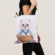 An adorable fluffy puppy sitting in a basket wearing a cute blue outfit. A soft and charming design perfect for dog lovers and kawaii fans.
