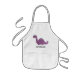This girls' apron features a cute illustration of a purple and green dinosaur with pink spots and long eyelashes. Personalize it with your child's name in black letters.