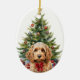 On the front of this Holiday ornament is the image of a cute buff colored Cockapoo Dog wearing a festive red bow. Behind the dog is a decorated Holiday tree. On the back, red and green text says MERRY CHRISTMAS", and there are additional text fields for you to customize. Make it say whatever you'd like!