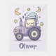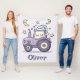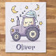 This cute personalized sleeping tractor blanket features a sleepy purple tractor wearing a cozy nightcap, surrounded by whimsical moons and twinkling stars with its soft pastel palette and charming "Kawaii" style.