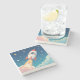 Cute red and white rocket blasting off in space with whimsical stars and clouds.