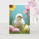 Designed with a single fluffy yellow hatchling as the main focus, the scene places it on a thick patch of green grass among scattered pastel egg shapes 🌷. Soft natural light highlights its downy texture, with a tiny orange beak and a glossy dark eye that seems to linger on the nearby eggs like a curious friend. A small dark marking near the eye adds character, like a little beauty spot that makes the chick stand out. The background fades into a gentle sky-blue blur with hints of yellow and pink flowers, giving the moment a quiet, spring-garden feel. The depth of field keeps the chick crisp while the eggs and blossoms soften into a hazy backdrop, like a private little corner of the yard. Across the upper area, “Happy Easter” appears in a simple light-colored font, easy to read against the blue. Near the lower edge, smaller text in soft gray sits just above the grass line, while pale rose, mint green, and buttery yellow eggs rest around the chick 🐇.