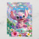 🌸 Invitation Description The image is an invitation card with a tropical, whimsical, and colorful theme, centered around the Disney character Stitch (from Lilo & Stitch). Character: A smiling, mischievous Stitch is featured prominently in the center. Theme: The background is lush and green with large, blurred tropical leaves and bright pink hibiscus flowers visible at the bottom. The atmosphere is festive. Color Palette: It uses bright, saturated colors, particularly vibrant blues, greens, and pinks. The background has an iridescent or holographic effect.