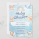 Cute baby shower invitations for baby boy featuring an adorable teddy bear, rainbow and clouds.