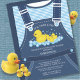 Invitation Baby shower Ducky avec la paire la plus jolie de salopettes pour bébés avec un canard maman et des canards triplet bébé. Unique Boys invitation baby shower pour un baby shower à thème canard pour les garçons triplés.