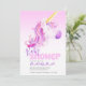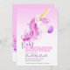 Invitations de douches pour bébé rose, avec une peinture à l'aquarelle de licorne lunaire mignonne. Personnalisez avec vos détails de baby shower. Dessin unique, aquarelle et design par Sarah Trett www.sarahtrett.com pour www.mylittleeden.com