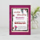 Une déplaisante invitation à la fête d'anniversaire mignonne avec un thème zombie. Conçu avec un garçon et une fille zombie cool. La fille a les cheveux roses et le garçon porte des vêtements en lambeaux. Ils ont tous deux des yeux vides vides et les bras tendus à la recherche de cerveaux et de plaisir aveugle. Les taches de peinture rouge sont éparpillées autour pour un effet déplaisant coloré au sang. Placé sur un arrière - plan rayé violet foncé.