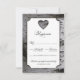 Cutout Heart Birch Tree Bark Wedding RSVP Cards - mit einem weißen Textfeld über einem Hintergrund einer Birkenbaum Rinde. Auf der Rückseite befindet sich die gleiche Birkenrinde. Die Texte verfügen über eine Mischung aus Schriftzeichen und Standardfarben in Schwarz und Grau.