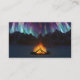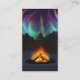In einem schneebedeckten Tal in einer frostigen Nacht im Winter springt ein Feuer hoch, um die Nordlichter zu spiegeln, die den Himmel über den fernen Bergen füllen.