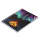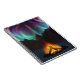 In einem schneebedeckten Tal in einer frostigen Nacht im Winter springt ein Feuer hoch, um die Nordlichter zu spiegeln, die den Himmel über den fernen Bergen füllen.