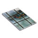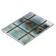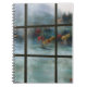 Eine kühle Herbstlandschaft, die durch ein mattiertes Fenster eines Morgens betrachtet wird. Tannen und Kiefern mit eisweißenden Nadeln, Ahorn in Rot-, Orange- und Gelbtönen, frostweißes Gras durch den Nebel aus einem versteckten Bach gesehen. An beiden Seiten des Fensters sind rot-grüne Rose-Blätter angebracht.