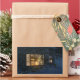 Blick in die Hütte an einem frostigen Winterabend kurz vor Weihnachten. Helle rote Kerzen sind heiß, was ein warmes Glühen über den Schnee aussendet. Der Weihnachtsbaum und der Keller sind mit Krümeln und Goldbällen geschmückt. Eine Kalickatze blickt aus dem Fenster auf eine Kichermücke, die draußen auf der Bügel sitzt, und ein Paar Füchse schielen um die Ecke des kleinen Hauses.