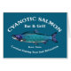 Ein blauer Sockeye Lachs mit Text, der "Cyanotic Lachs Bar & Grill Kenai, Alaska" und "Bekämpfen Sie die Erholung und Entspannung der Fischerei. Die Lachsfischerei ist sehr beliebt und in Alaska zu beliebt. Stellen Sie sich hundert Angler vor, ungefähr Schulter zu Schulter, die beide Ufer eines Baches belästigen und versuchen, in der Hoffnung, einen großen Lachs zu landen, die Überquerung von Linien mit allen anderen zu vermeiden. Das ist der Kampf gegen das Angeln. Nach einem Tag davon nehmen Sie etwas R&R am mythischen Cyanotischen Lachs in Kenai. Die Angelgeschichten haben dort erzählt...ein bisschen wahr.