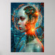 Elevate the aesthetic of your modern workspace, tech startup office, or dedicated gaming room with this spectacular cyberpunk wall art. This striking vertical poster features a highly detailed, futuristic illustration of a female cyborg. Blending photorealistic human features with exposed biomechanical wiring, glowing neon orange neural networks, and cyan holographic data screens, this artwork perfectly captures the cutting-edge collision of humanity and artificial intelligence.