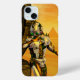 Künstlerisches, buntes und helles Science Fiction Bild in Gelb, Grün, Braun, Weiß. Titan cyborg aus Hyperion mit seinem lebhaften, reflektierenden Chromkarosseriebild in einer surrealen Umgebung mit Pyramiden, heiße Sonne, Wüste ähnlich einer ägyptischen Landschaft, Animationsrahmen aus dem 3D-Film Hyperion World . Es ist auch ein wunderschönes Geschenk für Weihnachten, Feiertage und besondere Anlässe.