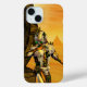 Künstlerisches, buntes und helles Science Fiction Bild in Gelb, Grün, Braun, Weiß. Titan cyborg aus Hyperion mit seinem lebhaften, reflektierenden Chromkarosseriebild in einer surrealen Umgebung mit Pyramiden, heiße Sonne, Wüste ähnlich einer ägyptischen Landschaft, Animationsrahmen aus dem 3D-Film Hyperion World .