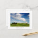 Carte postale d'un groupe de cyprès dans un paysage de collines vertes et de fleurs jaunes sous de beaux nuages blancs près de Torrenieri dans le Val d'Orcia (vallée de l'Orcia) en Toscane, Italie avec une frontière blanche et le texte : 'Toscane'.