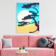 Leinwand in einer inspirierten japanischen Silhouette eines Zypressenbaumes, der einen Vollmond umrahmt, gegen einen Orangenhimmel aus Aqua und Korallen