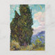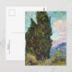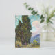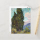 Eine kunstvolle Postkarte mit dem Gemälde, Zypressen (1890) des niederländischen Künstlers Vincent van Gogh (1853-1890). Eine postimpressionistische Landschaft mit einem großen Zypressenbaum im Vordergrund und einem bunten, wirbelnden Himmel mit einem Halbmond.