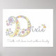 Poster de nom d'art P/monogramme parfait pour une chambre ou une salle de jeux pour filles dans les tons gris, blanc, jaune, rose et violet. Personnalisez avec le nom de votre enfant commençant par D, et le nom signifiant une touche vraiment personnalisée à la chambre ou à la crèche de votre enfant, cet exemple est pour le nom D Dixie. Dixième. Une beauté méridionale intelligente et gentille. Mignonne affiche idéale pour un nouveau bébé, un baptême ou un cadeau de baby shower. © Lettre initiale unique D coeurs et fleurs description du dessin et graphisme par Sarah Trett. www.sarahtrett.com pour www.mylittleeden.com