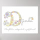 Poster de nom d'art P/monogramme parfait pour une chambre ou une salle de jeux pour filles dans les tons gris, blanc, jaune, rose et violet. Personnalisez avec le nom de votre enfant commençant par D, et nom signifiant pour une touche vraiment personnalisée à la chambre ou à la crèche de votre enfant, cet exemple est pour le nom D Djinda Bright star, indépendant, un perfectionniste. Mignonne affiche idéale pour un nouveau bébé, un baptême ou un cadeau de baby shower. © Lettre initiale unique D coeurs et fleurs description du dessin et graphisme par Sarah Trett. www.sarahtrett.com pour www.mylittleeden.com