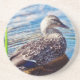 Ein Foto einer weiblichen Mallard-Ente, die im flachen Bereich eines Teiches stehend ist, wobei sich Wasserarme in kreisförmiger Bewegung von ihr wegbewegen. Copyright Kimberly J Tilley.