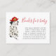 Carte de demande de baby shower à thème pompier mignonne avec aquarelle illustrant un chiot dalmate avec le casquette d'un pompier. La carte demande aux clients d'apporter un livre pour enfants neuf ou d'occasion au lieu d'une carte.