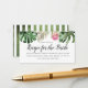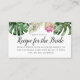 Carte d'insertion moderne pour une douche de mariée ou de mariage sur le thème tropical, avec une illustration aquarelle de feuilles vertes comprenant des feuilles de monstera, de palmier et une fleur de protea roi rose. La carte demande aux invités de remplir la carte de recette et de l'apporter à la douche. Envoyez cette carte avec la carte de recette correspondante disponible dans ma boutique !