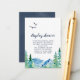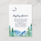 Cette carte de présentation de douche Rocky Mountain est parfaite pour une douche de mariage en plein air ou une douche bébé. Le design présente un paysage sauvage peint en bleu et vert avec des arbres, des oiseaux et des montagnes à l'aquarelle.