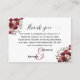 Cette élégante Carte de Présentation de Panier de Bienvenue Floral Bourgogne pour mariage avec une calligraphie très élégante peut être facilement personnalisée pour votre événement très spécial ! C'est une belle façon de remercier vos invités venus de loin pour le voyage qu'ils ont dû faire pour célébrer avec vous votre grand jour. Avec cette carte personnalisée, vous êtes à un pas de transformer votre célébration en un événement remarquable.