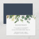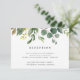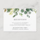 Conçue pour aller avec notre collection de mariage Eucalyptus Grove, cette carte de réception botanique luxuriante présente un spray de feuilles aquarelles et de feuillage d'eucalyptus vert, avec vos détails de réception, heure et adresse.