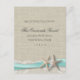 Invitation de mariage de plage rustique avec l'aspect romantique de toile de jute et de dentelle, accentué d'étoiles de mer et d'un design de ruban aqua.