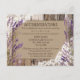 Lavande fleurit sur le motif à l'allure de lin, la dentelle chantilly blanche, et la carte d'hébergement rustique arrière - plan en bois de grange mariage.