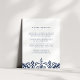 Conçue pour s'harmoniser avec notre collection de faire-part de mariage d'inspiration marocaine, cette carte simple et chic présente du lettrage bleu marine accentué d'une frontière géométrique marine et blanche complexe le long du fond. Remplacez l'exemple de texte par les détails clés de votre célébration mariage. Vous vous demandez quelles informations inclure sur un encart faire-part de mariage ? Prenez en compte des détails comme l'hébergement à l'hôtel, les codes de groupe, le transport, l'itinéraire, les informations sur la réception de bienvenue et votre URL du site Web mariage. Vous pouvez même télécharger une carte vers l'envers à l'aide de la fonction personnaliser it. Vous avez besoin d'aide pour le libellé ou la mise en forme? J'adorerais aider ! Contactez Kristen via le lien "Demandez à ce concepteur".