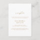 Cette carte d'encarts de réception de mariage en or moderne est parfaite pour un mariage minimaliste. Le design de couleur or jaune simple présente une typographie industrielle unique avec style boho moderne. Personnalisable dans n'importe quelle couleur. Gardez le design minimal et élégant, en l'état, ou personnalisez-le en ajoutant vos propres graphiques et artwork. Personnalisez cette carte détaillée de boîtier avec vos informations de réception et incluez également votre adresse de site mariage !