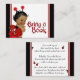 Apportez une carte de baby shower de livre avec adorable jeune fille afro-américaine portant une tenue de coccinelle rouge et noire sur un arrière - plan rouge et noir avec du texte de coccinelle rouge sur le devant. Vous pouvez modifier la couleur de l'arrière - plan de bord. Ajoutez le texte de votre choix dans le style de police que vous préférez.