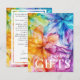 Présentation de la carte verticale "Note sur les cadeaux" de la collection "Ethereal Bloom", offrant aux couples une façon sophistiquée et personnalisée de communiquer leurs préférences en matière de cadeaux à leurs invités. Sur le devant, dans un décor envoûtant d'oeuvres d'art vibrantes à l'encre d'alcool, avec des teintes tourbillonnantes de bleus, violets, rouges, oranges et verts, la légende élégamment affichée "Note sur les cadeaux" attire immédiatement l'attention. Ce design réfléchi invitation les clients à considérer les préférences du couple en matière de cadeaux avec grâce et style. En retournant vers l'arrière, les clients sont accueillis par un arrière - plan blanc serein orné d'une subtile extension de l'oeuvre d'art éthérée dans le coin inférieur, créant un design harmonieux et enchanteur. Dans ce cadre tranquille, un grand espace est prévu pour que le couple puisse partager un message chaleureux et personnalisé. Ici, ils peuvent express leur gratitude et leur reconnaissance pour la présence de leurs invités, tout en les guidant doucement sur les préférences de cadeaux. Qu'il s'agisse de diriger les invités vers un registre ou d'offrir des idées pour des cadeaux sensés et réfléchis, cet espace permet au couple de communiquer leurs souhaits avec chaleur et sincérité. Cette carte verticale "Note sur les cadeaux" de la "Collection Ethereal Bloom" offre un moyen chaleureux et élégant pour les couples de transmettre leurs préférences, en s'assurant que chaque aspect de leur célébration mariage est imprégné de beauté, de personnalisation et d'une touche de flair artistique.