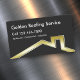 Dach-Service Visitenkartenmagnete-Vorlage mit schwarzem Hintergrund und goldaussehendem Dachsymbol für eine Dachabdeckung, Zuhause-Umbau oder Bauunternehmer.