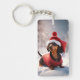 Photo d'un mignon dachshund portant un casquette de Noël. Le design a été créé avec l'utilisation de l'IA. Vous pouvez facilement remplacer la photo par une photo de votre propre. Le dos du porte - clé est rempli d'une couleur rouge foncé.
