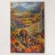 Feiern Sie die Schönheit des Herbstes mit diesem lebendigen Gemälde eines Hundes, der neben einer reichen Erntedank-Ernte sitzt. Die reichen Herbstfarben von Kürbissen, Sonnenblumen und die rustikale Landschaft der Bauernhäuser schaffen eine warme und einladende Atmosphäre, die sich perfekt für jeden Hundefreund im saisonalen Dekor eignet.